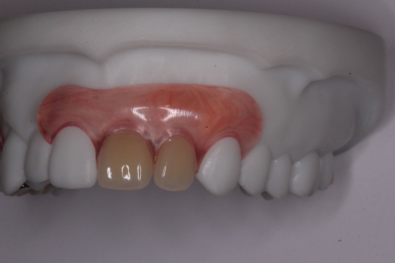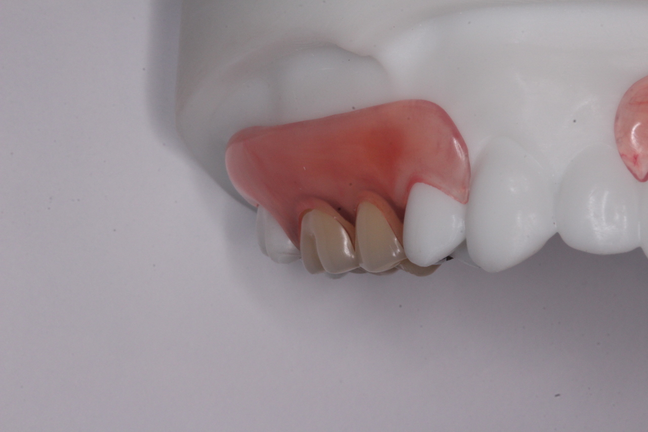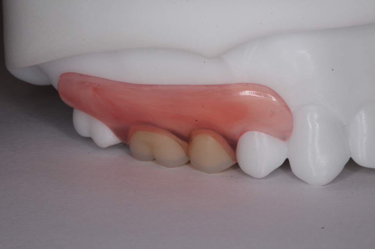 フレキシブルデンチャーは「アルティメット樹脂」という材質を使用して作製した、ノンクラスプデンチャー(金属のバネがない入れ歯)です。アルティメット樹脂は、現在ノンクラスプデンチャーに使用できる樹脂の中で、いちばん耐久性がある材料となります。そのアルティメット樹脂と金属のワイヤーを併用することで、より強度を高めています。